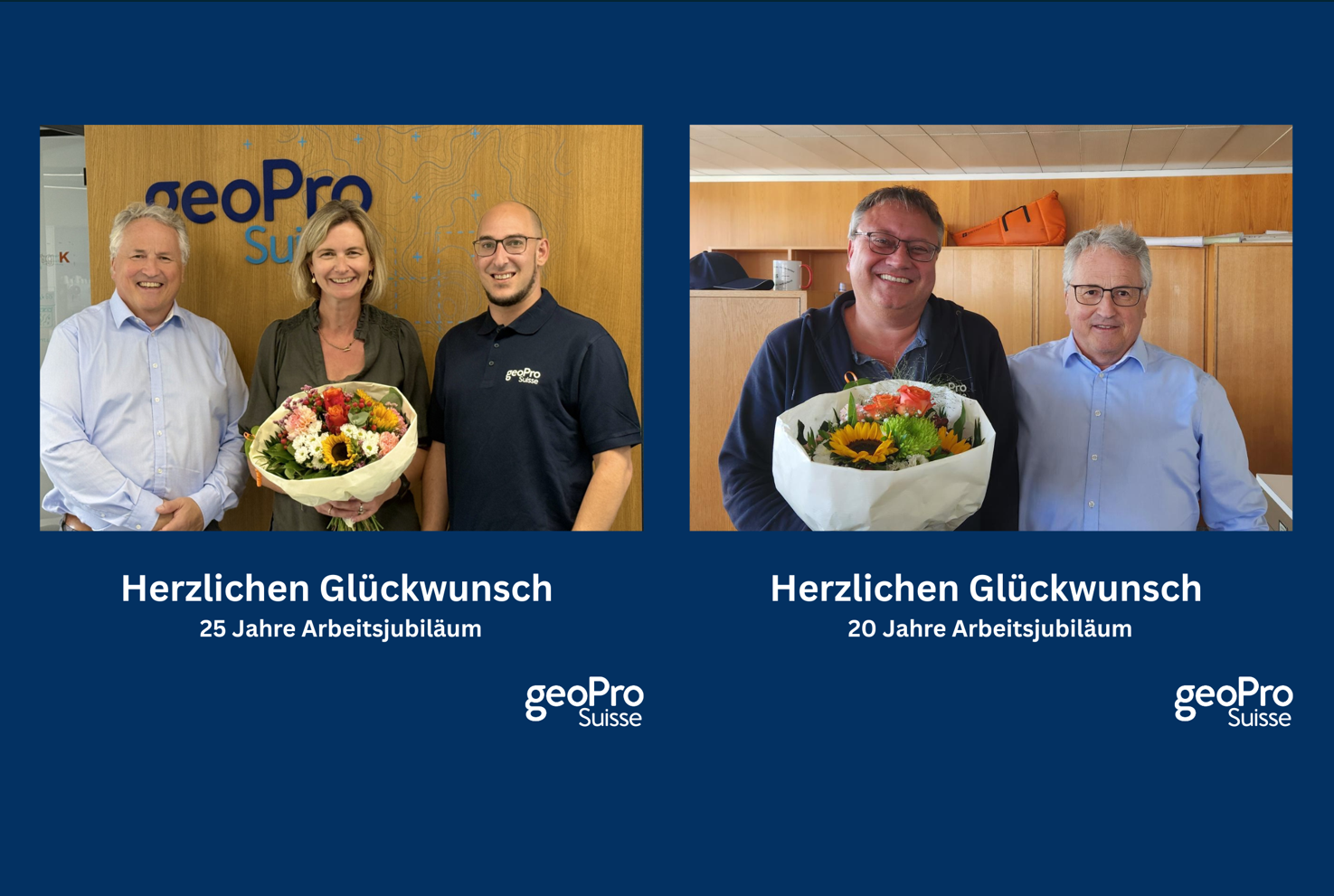 Unsere Mitarbeitenden sind das Herz von geoPro Suisse – umso mehr freuen wir uns, zwei langjährige Jubiläen feiern zu dürfen: